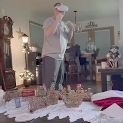 A man in the kitchen wears a virtual reality headset and plays a VR game. He runs straight into the cabinet. Security Footage. Music rights not cleared.