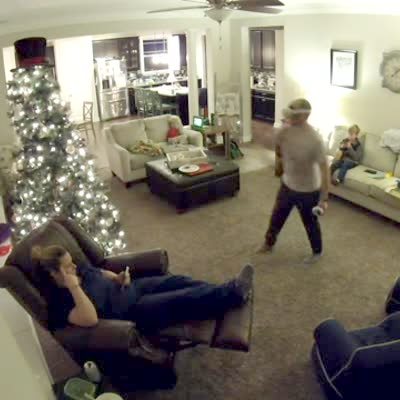 A young boy plays a virtual reality video game when he runs forward and hits the television, breaking it with his controller. Security footage.