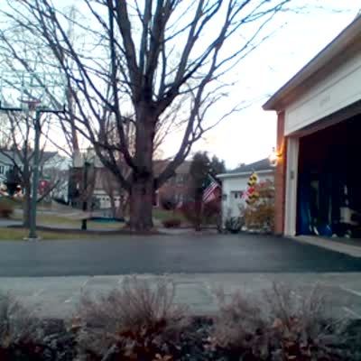 A man looks into the camera and throws a rubber ball over his shoulder and the ball hits the roof and rolls off, bouncing off a mini-trampoline, and goes into a basketball net on the lawn.
