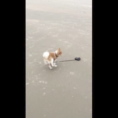 A man carries a pit bull dog over to the water at a beach and sets the dog down at the edge of the water. Then the dog picks up the end of his own leash and runs with it back to the beach.