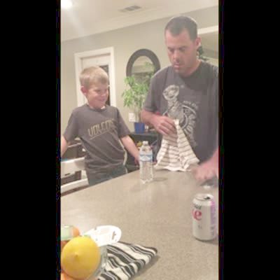 A man gets his son to look into a bottle of water. The man tries to spray water on the boy, but misses and sprays his own face. The boy falls out of his chair.
