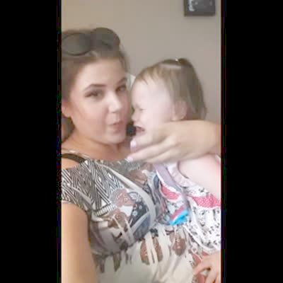 A tot girl cries after she puts her pacifier in her mother's mouth when she pretends to cry on the couch.