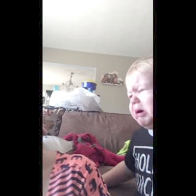 A woman pretends to cry so her tot son puts his pacifier in her mouth then he starts to cry