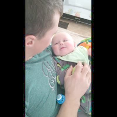 A baby boy laughs each time his dad spits his pacifier at the baby until he spits it out and it goes directly into the baby's mouth.