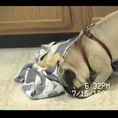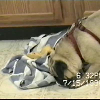 Dog/ pug with a pacifier in its mouth runs away from owner so the man won't take the pacifier away