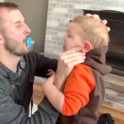 A man spits a pacifier into his tot boy's mouth in slow motion. The tot boy catches the pacifier as the man laughs in the living room.