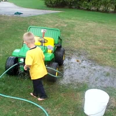 Tot boy washes his electric jeep in the yard, falls backwards into his water bucket