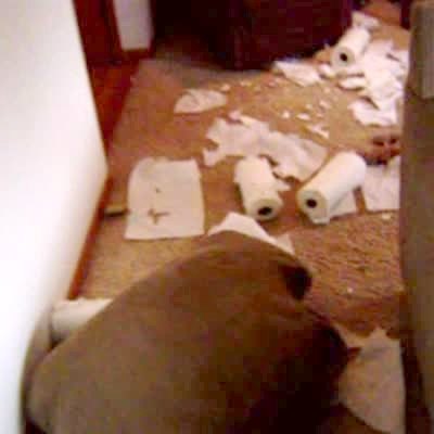 A man holds on to his dogs front paws and makes the dog "clean up" the paper towel roll the dog tore apart.