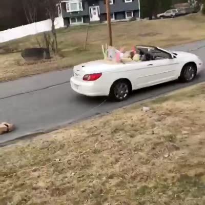 A car runs over a young boy's birthday present in a street as a parade of cars drive past his house to celebrate in quarantine and his mom yells and laughs.