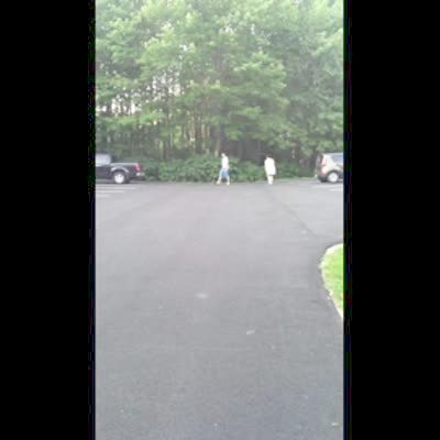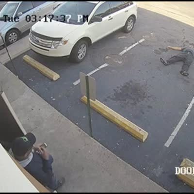 A man parks a car in a parking lot and gets out and gets chases by a goose bird and gets knocked to the ground. Security camera.