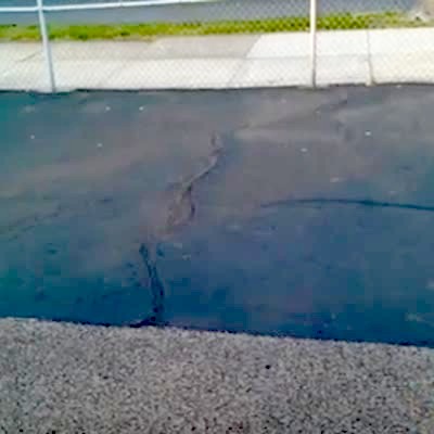 A woman bends forward and splits her jeans in a driveway.