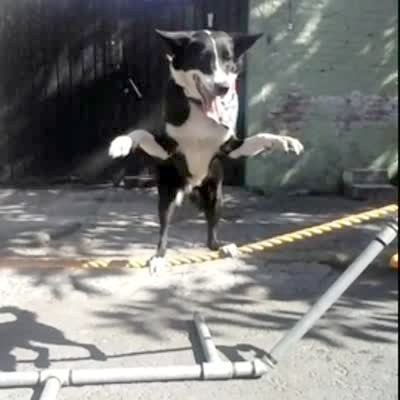 A dog stands up on its back legs on a slackline tight rope. Trick