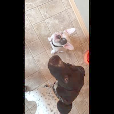 A man pretends to put a squeak toy ball in one of his hands and when he opens it and it's not there his french bulldog dog turns and looks at the camera.