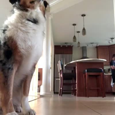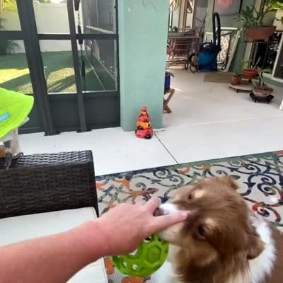 A woman hands a toy to a bird in the house, and the bird tosses it to an Australian Shepherd dog repeatedly.