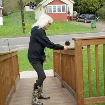 A woman taps her fingers on a patio handrail and a pigeon follows them, then jumps onto her hand.