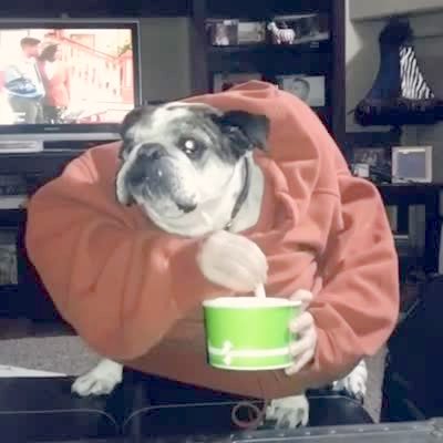 A bulldog dog eats ice cream with someone else's hands in a living room.