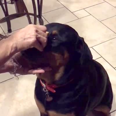 A woman puts a treat on a dog's nose in the kitchen and the dog waits until she gives the command it and it eats the treat in slow motion.