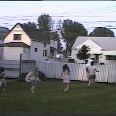 A teen girl and young boy bat around a volleyball outside in front of a white picket fence. The ball bounces off a rock and hits the boy in the face. The girl doubles over laughing as the boy falls to the ground holding his head.