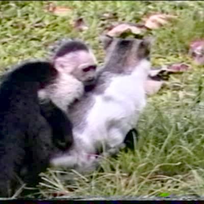 A young girl gets on another young girl's shoulders in the backyard, then a Boston terrier dog jumps up and knocks them over. Slow motion.