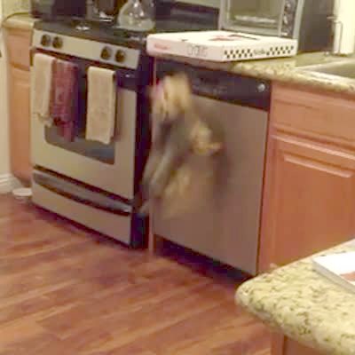 A dog repeatedly jumps to get pizza off the kitchen counter and it grabs the tray that the pizza is on and pulls it down, but flips the pizza off and flings it across the room. steal