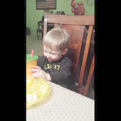 At a dining table, a tot boy dozes off while he continues to eat his food. He then shushes a man and woman as they ask if he wants some milk.
