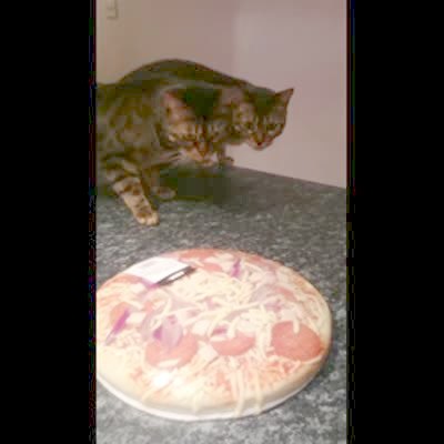 Two cats jump off of a counter in fear when a woman slightly moves a frozen pizza towards them.