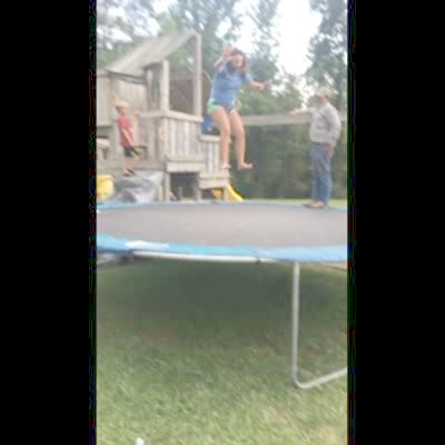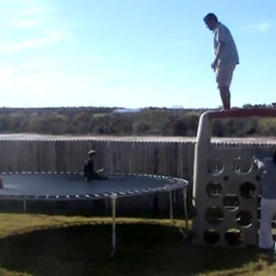 Man tries to jump off a playhouse onto a trampoline, he slips and falls on the trampoline. Bonehead.