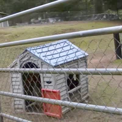 Dog jumps through small hole in a playhouse when boy calls dog's name from inside the playhouse.