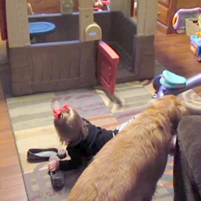 A tot girl is playing in a playhouse inside. She pushes on the roof and the whole thing collapses at 0:29.. She falls to the floor with the roof coming down on her.