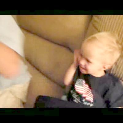 Tot boy says "Obama," then man says 'No Obama" and then tot boy laughs.