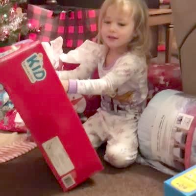 A tot boy has opened a shipping box and finds a present before Christmas. His mother asks "So did you did you rip that box open through the tape and everything?" The boy confirms he did.