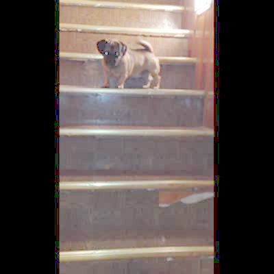 A pug dog runs back and forth on a step at home, scared to go down. When another pug walks down the first dog tries to go after and falls down the stairs.