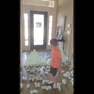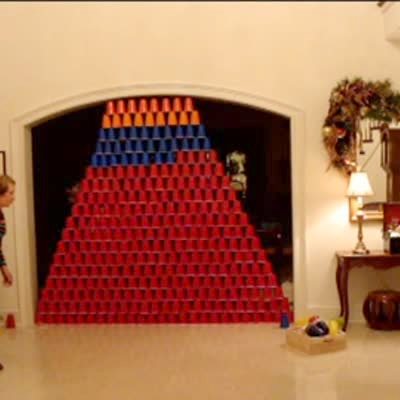 Five kids jump through a huge pyramid of plastic cups in the living room. Senior woman barely gets out of the way in time.