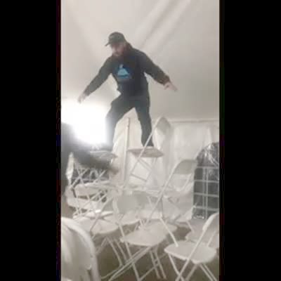 A man stands on top of a pyramid made of fold out chairs. He loses balance and falls down. The chairs disassemble.