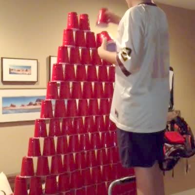 A young boy builds a large pyramid of plastic cups in a living room. He says "last one" as he is about to finish it but the whole tower falls before he can add the last cup.