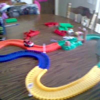 A Labrador dog lays in the middle of a toy race car track in a tot boy's playroom and lifts his head whenever the toy car bumps in to it.