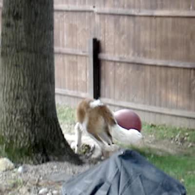 Dog has a red ball stuck on its face. The dog shakes its head until the ball falls off.
