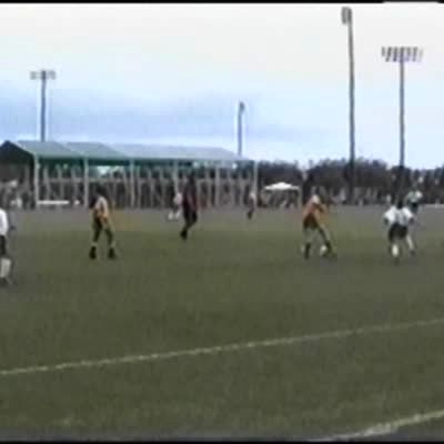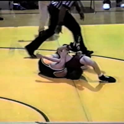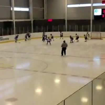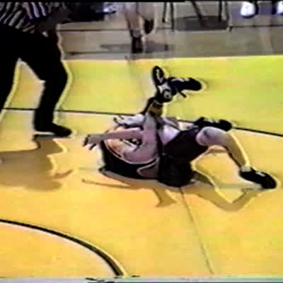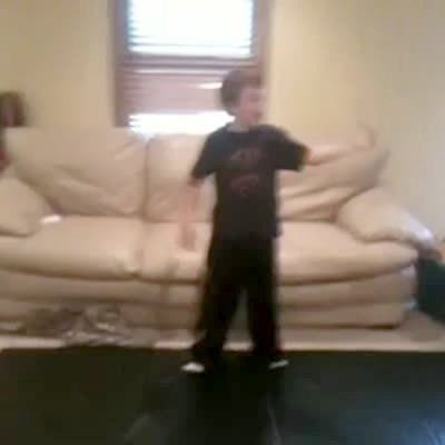 As a boy acts a referee, a girl runs at another boy in a living room over a gym mat carrying an exercise ball. She smashes into the boy, knocking him into a bucket of toys instead of an air mattress set up as a crash pad. Very jerky camera.