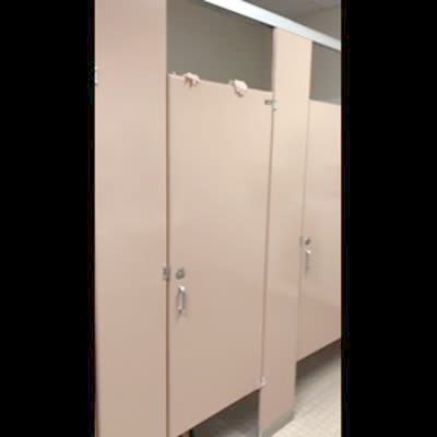 A teen girl falls in a public bathroom when the door to a stall breaks off as she hangs on it.