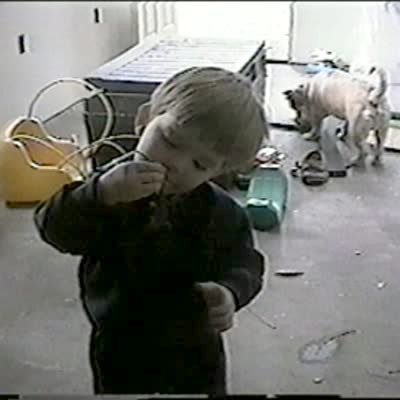 Tot boy in garage is playing with a lizard and the lizard bites his finger, kid screams and mom puts camera down saying "it's okay"