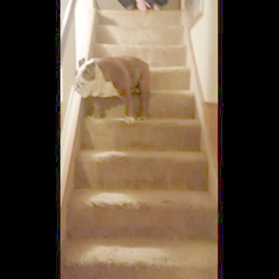 A dog walks backwards with a toy across the house entryway while the man behind the camera makes a "beep" noise.
