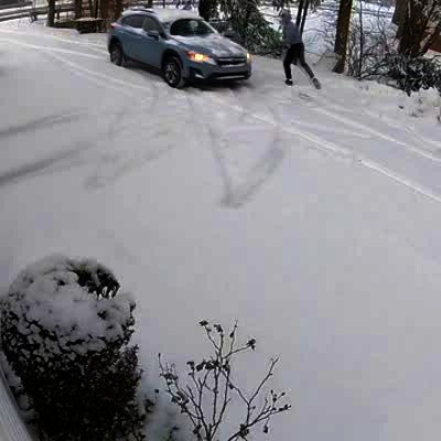 A woman gets out of a vehicle in a snowy driveway and forgets to put it in park, as she then chases after the car after she hands someone her toddler. Security footage.