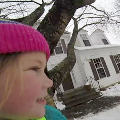 A girl crashes through a Snowman on a sled. The clip plays repeatedly and in reverse.