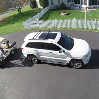 Security camera footage of a man who backs a car up in the driveway and bumps into a parked boat trailer. The trailer moves down the hill and into the yard.