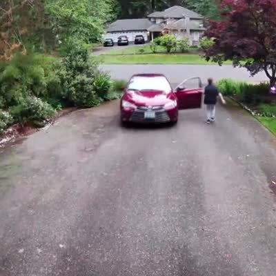 A car rolls down the driveway in reverse and crosses the street and a man runs out of the garage and trips and falls. Security footage.