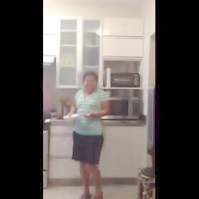 A woman in the kitchen throws a bowl of rice up in the air when the camera person comes into the room and screams at her. scares her.