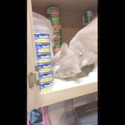 When a man opens his kitchen cabinet he sees their cat who eats their rice.