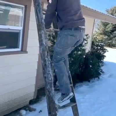 A man climbs a rickety-looking ladder, and the ladder collapses on him immediately when he climbs it.
