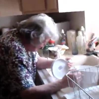 Senior woman gets sprayed by a faucet rigged in a practical joke. Kitchen sink. She says "I peed my pants."