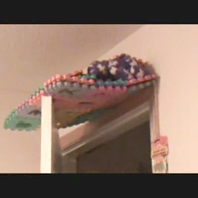 Boy rigs toys over bedroom door so that they fall on girl when she opens door. Practical joke.